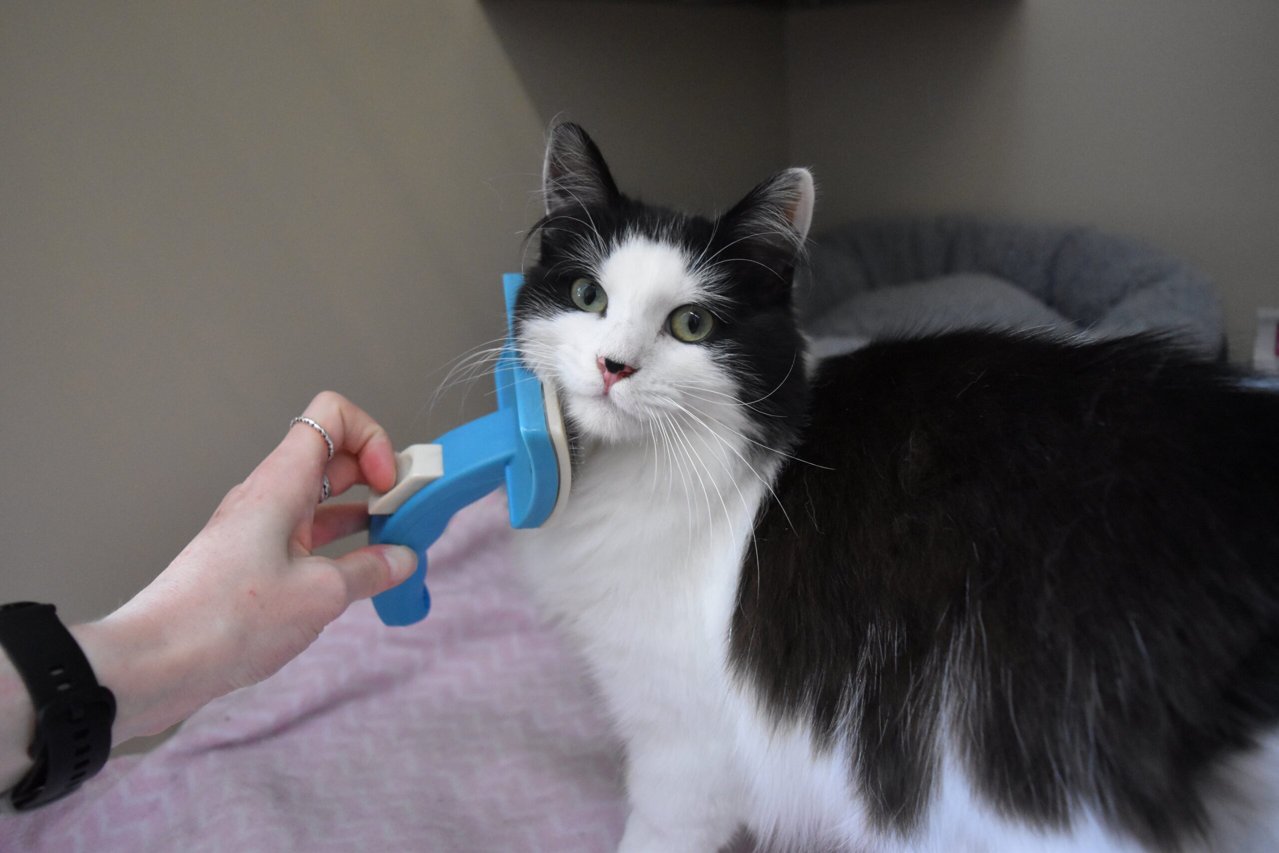 As well as napping, cats spend a fair part of their day grooming, and when the weather is getting warmer and their coats begin to shed, it’s important we brush them more often – daily if they have a long coat. All cats need brushing, indoor or outdoor, as it helps to prevent hairballs and evenly distributes oils to keep skin and fur in peak condition. If a brush is designed for long-haired cats and your short-haired cat loves it, that’s fine! In the end, it comes down to what they enjoy most. For timid or brush-adverse kitties, there are comb-like gloves, and you can offer them treats while you’re brushing them as a welcome distraction. Sometimes the key is several short sessions rather than one long session. If your cat’s fur is matted, professional assistance from your veterinary clinic is advised. A professional clip will also help long-haired cats keep cool in summer and will also help you with checking their coat for ticks.